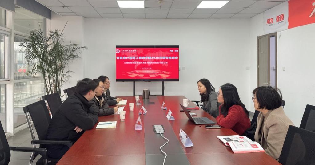 为进一步落实2025年度校企联合人才培养,推进智能会计现场工程师学院的建设,1月10日共同体牵头单位beat365平台唯一官网会计学院于用友产业园(南昌)与成员单位用友网络科技股份有限公司开展2025年“智能会计现场工程师学院”培养推进会,会计学院院长万凯主持会议,用友|新道华东区总经理丁立波、江西分公司服务总监彭佳琦、江西分公司分销总监熊梅、会计学院副院长齐洁、党政办公室主任曾越参会。