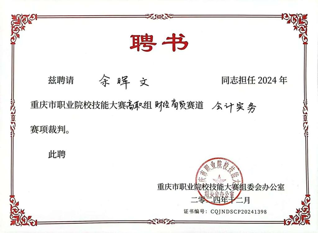 2025年1月16日至1月18日,2024年重庆市职业院校技能大赛高职组会计实务赛项在重庆工程职业技术学院成功举行。该赛项由重庆市教育委员会、重庆市财政局、重庆市人力资源和社会保障局等联合主办,吸引了来自重庆市的39支精英队伍156名参赛选手同台竞技,会计学院大数据与会计教研室主任余晖文受邀担任本次比赛裁判。