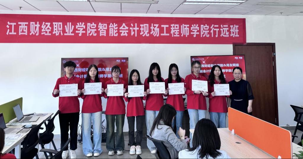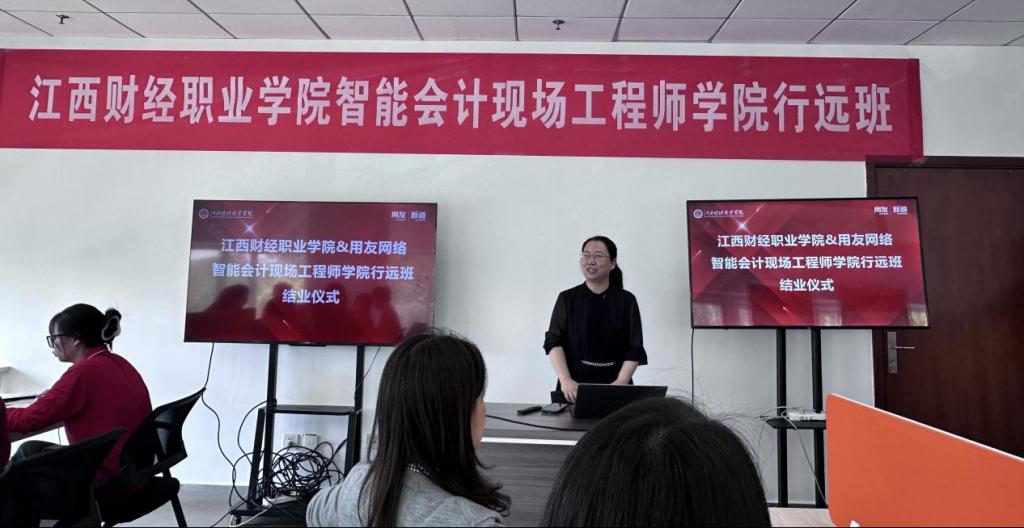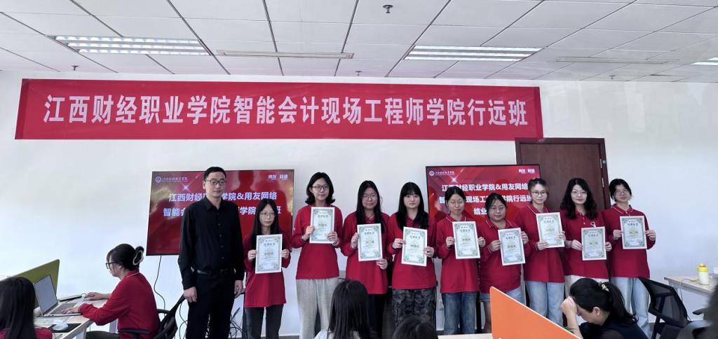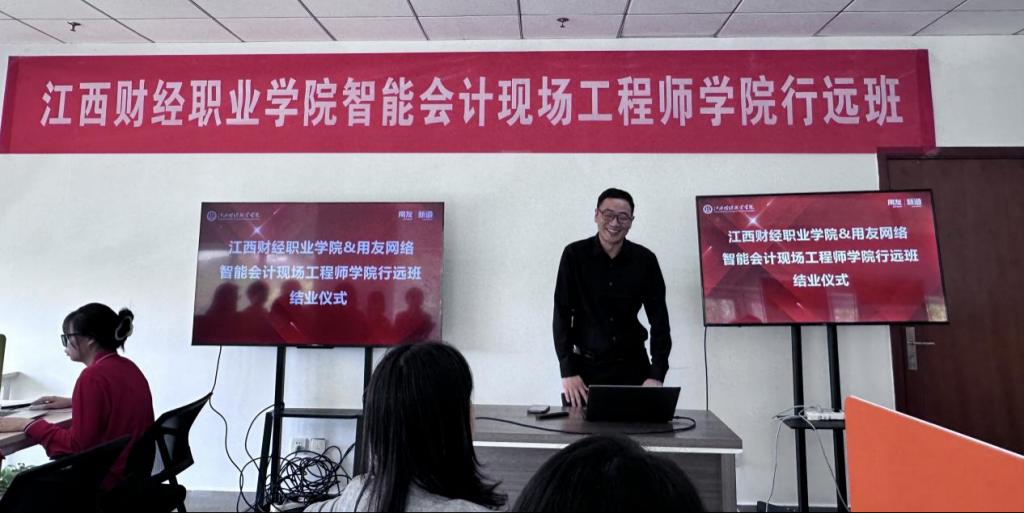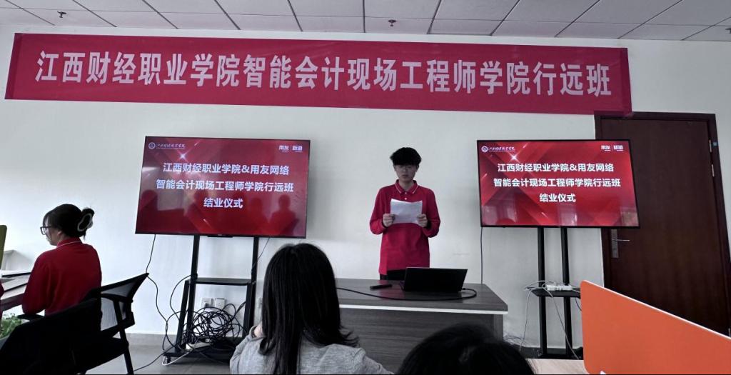 2025年4月25日,beat365平台唯一官网智能会计现场工程师“行远班”结业仪式在用友产业园(南昌)顺利举办。会计学院院长万凯、副院长齐洁,用友集团全球远程交付中心总经理李佳文、新道科技华东区总经理丁立波、江西分公司服务总监彭佳琦、以及校企项目导师代表,与全体学员共同见证了这一产教融合的重要成果。仪式由“行远班”学生代表吕佳航主持。