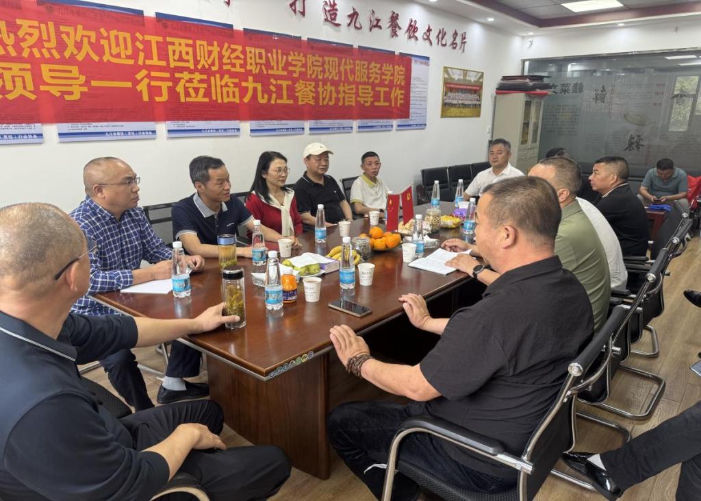 为进一步加强校企协同创新、人才培养模式优化、实习实训基地拓展、共同谋划校企合作发展新路径,2025年4月28日下午,现代服务学院(本科部)党总支书记高小兰、副院长(主持工作)姜启跃、烹饪专业教师(外聘)叶为国、学生科负责人刘玉兵一行,来到九江市餐饮(烹饪)行业协会开展访企拓岗活动,考察交流及洽谈烹饪专业学生的人才培养方案与未来毕业实习就业等合作,九江锦绣江南、盛世麒麟、鱼头泡饭、新光明等餐饮企业负责人参加了座谈会。