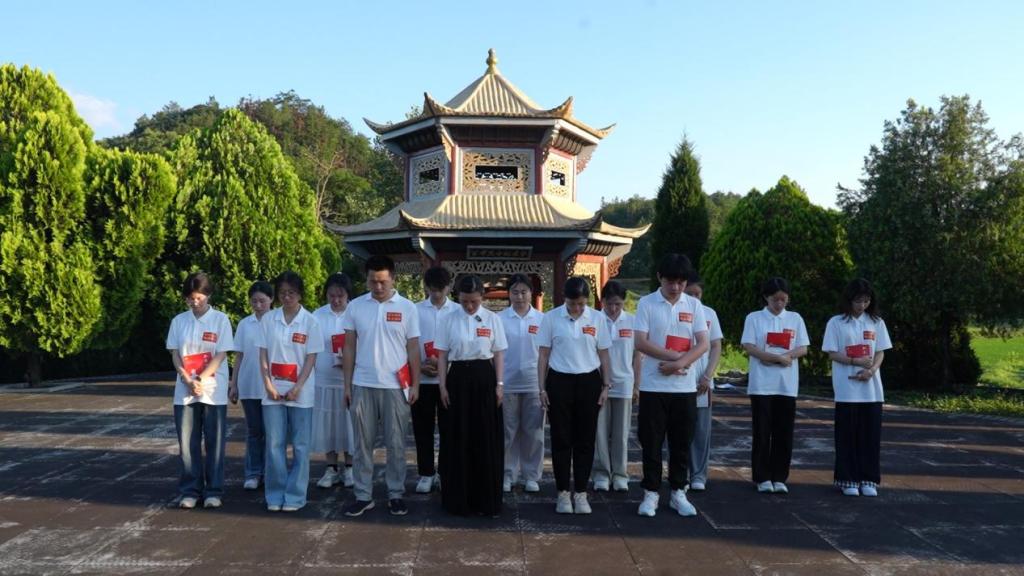 革命烈士纪念碑前,气氛庄重肃穆。学生代表身着红军服,以《瑞昌战役中的青春壮歌》为题,重现当地红军战士李大山为掩护群众转移,坚守阵地直至弹尽粮绝的英雄事迹。他们用激昂的语调还原烈士就义前的慷慨陈词,用细腻的动作演绎军民互助的温暖瞬间,“乡亲们,往前冲,我来断后!”一句饱含赤诚的台词,让在场师生仿佛穿越时空,置身于那段波澜壮阔的革命岁月,不少人热泪盈眶。表演结束后,全体师生向纪念碑敬礼,集体默哀三分钟,在“继承先烈遗志,传承红色基因”的集体宣誓声中,完成了一场深刻的红色精神洗礼。“碑体的温度,是穿越时空的精神对话,纪念碑的高度,是红色精神的海拔,我们要做攀登者,更要做传承者。”2023级会计专业学生谈顺江的感受引发共鸣。