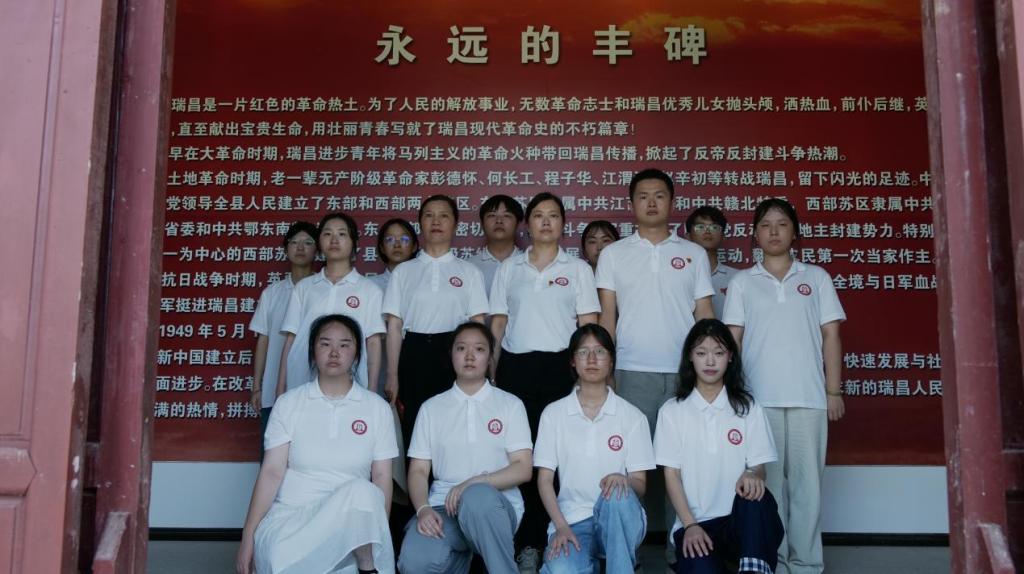 在洪一乡瑞昌县苏维埃革命纪念馆,300余件承载着革命记忆的红色文物构成了立体的红色教材库。泛黄的革命手稿上,“为劳苦大众谋幸福”的字迹虽已模糊却透着穿透时空的坚定;锈迹斑斑的军号旁,摆放着记录其在五次反“围剿”中吹响冲锋号的战地日记;带弹痕的旗帜上,还留存着红军战士用鲜血浸染的暗红印记。学生们在讲解员引导下,循着“星火初燃”“浴血奋战”“解放曙光”“精神传承”四大红色主题展区,逐件研读文物背后的红色故事,凝视烈士墙上 300 多个名字,直观了解当地革命历程。“这些展品是先辈们用生命镌刻的精神坐标,这些名字背后是用生命守护的红色信仰,我们必须让这份信仰永远鲜活。”2023级会计专业学生周志晨的感言,道出了师生共同的体悟。