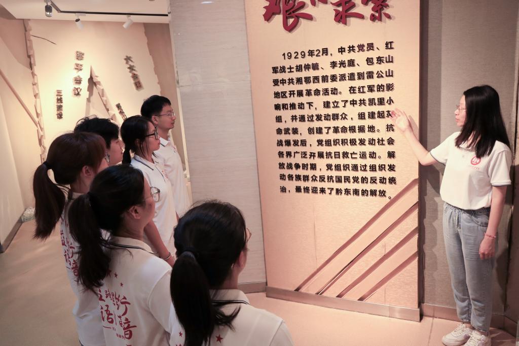 实践队队员专程前往凯里党史陈列馆参观学习,在泛黄的史料、斑驳的实物前,队员们仔细聆听黔东南地区的革命故事,感受当地与江西红色血脉相通的奋斗历程。从红军长征过黔东南的足迹到各族群众支援革命的事迹,队员们边学习边记录,将这些红色素材转化为推普思政课的生动教材,为后续走进校园播撒红色种子筑牢基础。