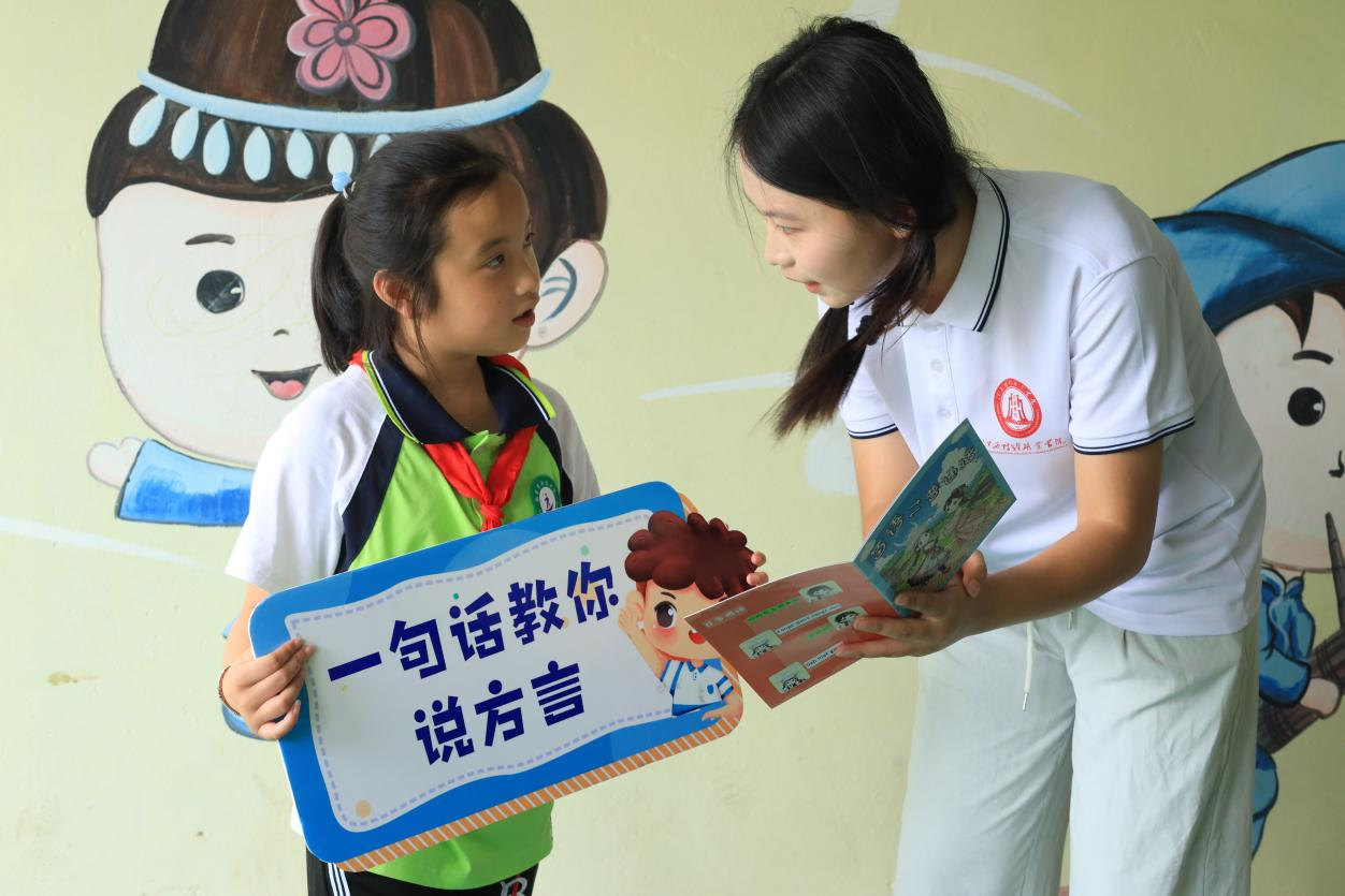 在舟溪小学,实践队与苗族孩子们开展了“一句话教你说方言”互动活动。苗族孩子们化身小老师,热情地教队员们苗语问候与祝福,自豪地介绍苗族的传统节日和特色活动;队员们则用普通话为孩子们讲述山外的世界。这种双向的语言交流,成为一堂生动的“民族融合课”。