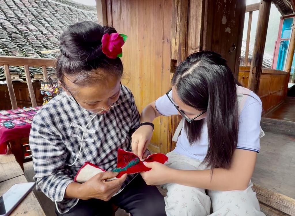 “姐姐,‘盘针绣’的‘盘’字怎么读呀?”苗家小姑娘佳怡举着未完工的蝴蝶绣片,眨着大眼睛问道。实践队员拿出拼音卡片,一字一句地教她。在苗绣小课堂上,孩子们不仅学刺绣,还学普通话。他们用稚嫩的声音讲述苗绣故事,有的甚至成了家里的“文化小使者”,把学到的知识讲给远方的父母听。“我要学好苗绣,也要学好普通话,让更多人知道我们的文化!”佳怡的话语里满是自豪。