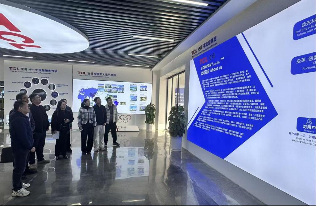张洪引领万凯一行参观TCL空调智能制造工厂,详细介绍数智化运营中心对物料、设备、能耗进行的实时监控调度,并就成本核算、智能排产、数据治理等数智财务技能需求展开交流。随后,双方移至公司党员活动室,就校企发展历史、取得成果,支部党建成效以及财经类人才共育、实习就业等方面进行了深入沟通。