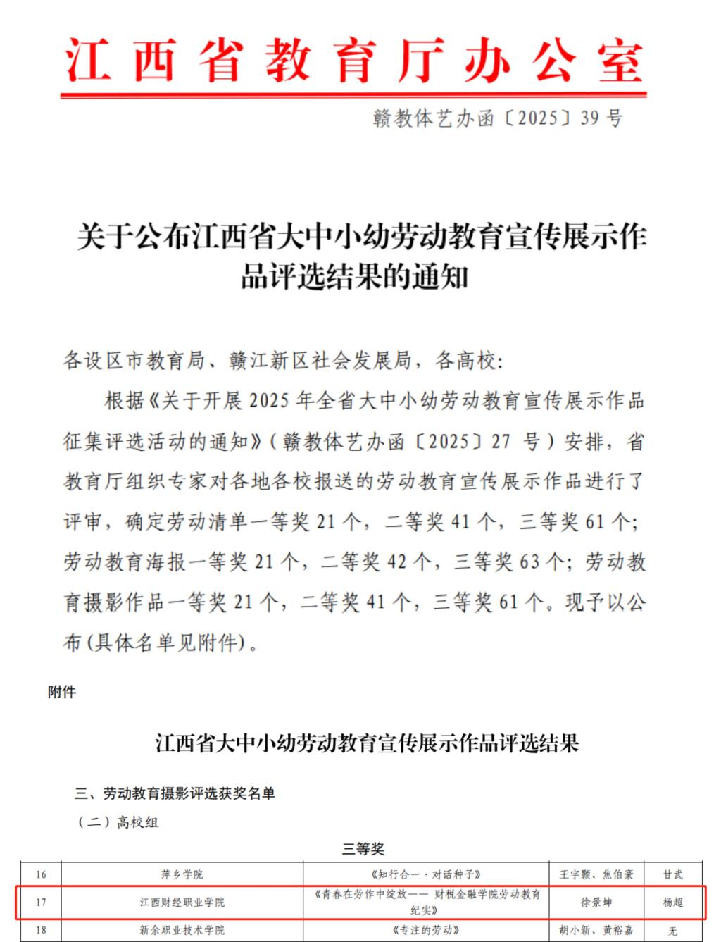 近日,江西省教育厅公布了2025年全省大中小幼劳动教育宣传展示作品评选结果。
