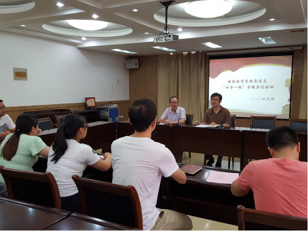 6月23日下午,为贯彻落实校党委“两学一做”学习教育的精神和工作要求,继续教育学院党总支书记吕建斌在培训中心二楼会议室讲党课,beat365全体教师党员、学生党员出席活动。
