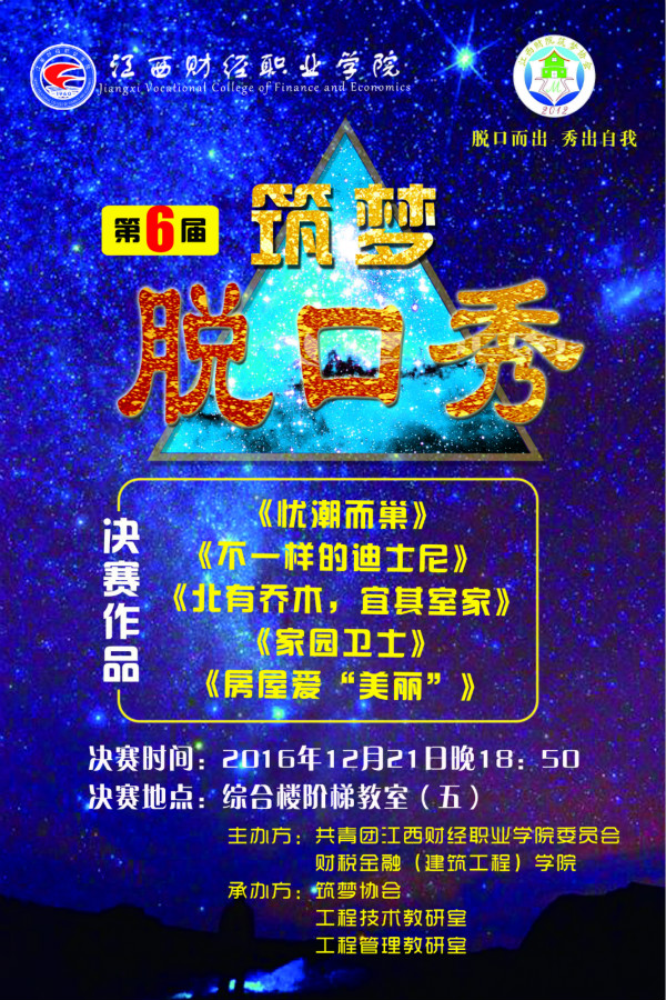 12月21日晚,第六届筑梦脱口秀在综阶五教室成功举办,本届脱口秀由财税金融学院、校团委共同主办,筑梦协会承办。出席本次活动的嘉宾老师有计划财务处处长刘双红教授、财税金融学院吕亨龙副院长,财税金融学院办公室主任吕霁老师,工程技术教研室主任王伟老师。16工程造价、16建设工程管理、16工程技术班班主任杨义刚老师、张晶晶老师、程静老师、张乐老师以及第四届、第五届筑梦脱口秀的冠亚季军共同担任了本届脱口秀的评委。