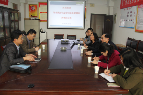 4月21日上午,河北旅游职业学院商务管理系主任张成龙、教研室主任杨永峰来beat365进行交流研讨。武丹副院长热情接待了张主任一行,并在综合楼903办公室召开了市场营销专业建设与教学改革交流研讨会。经济贸易学院院长吴炜教授、市场营销教研室主任易娇艳、钟思、黄文君等老师参加了会议。