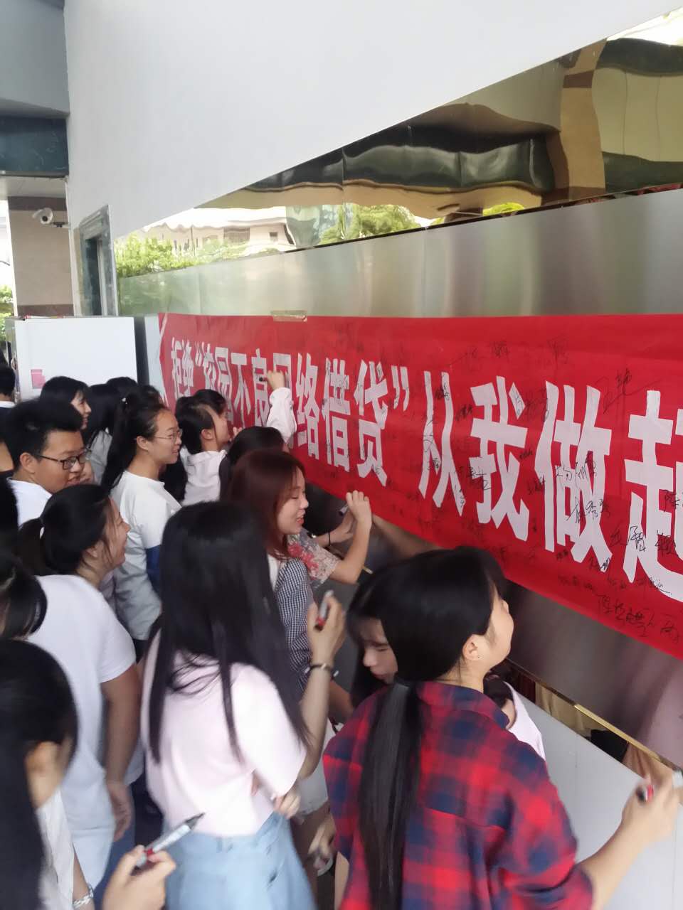卢书记首先做了主旨讲话,他要求同学们看清网络贷款的真实危害性,树立勤俭意识,养成文明、健康的生活习惯,要合理消费、理性消费、科学消费;不参与、不宣传校园贷违规违法活动;不鼓动、不胁迫他人在校园贷中借款;不张贴、不转发校园贷违规违法信息;不冒用、不顶替他人身份进行校园贷款。全体同学在深刻了解了不良网贷的严重危害后,纷纷在宣传横幅签上名字,表明自己坚决抵制不良网贷的坚定态度,呼吁更多的学子拒绝校园不良网贷。