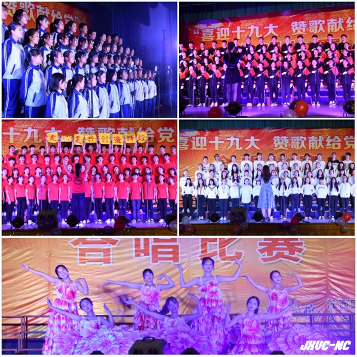 比赛在2017级会计26班带来的合唱歌曲《爱我中华》中拉开序幕。《红星闪闪》、《当那一天来临》、《游击队之歌》、《打靶归来》等军旅歌曲表达了同学们的豪情壮志, 《没有共产党就没有新中国》、《团结就是力量》、《歌唱祖国》、《走向复兴》等歌曲唱出了同学们对党、对祖国的满腔热爱,充满正能量的歌声响彻校园。
