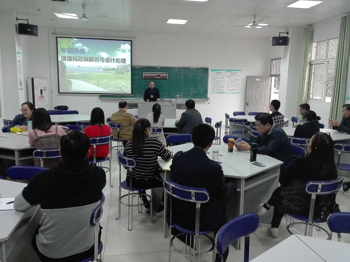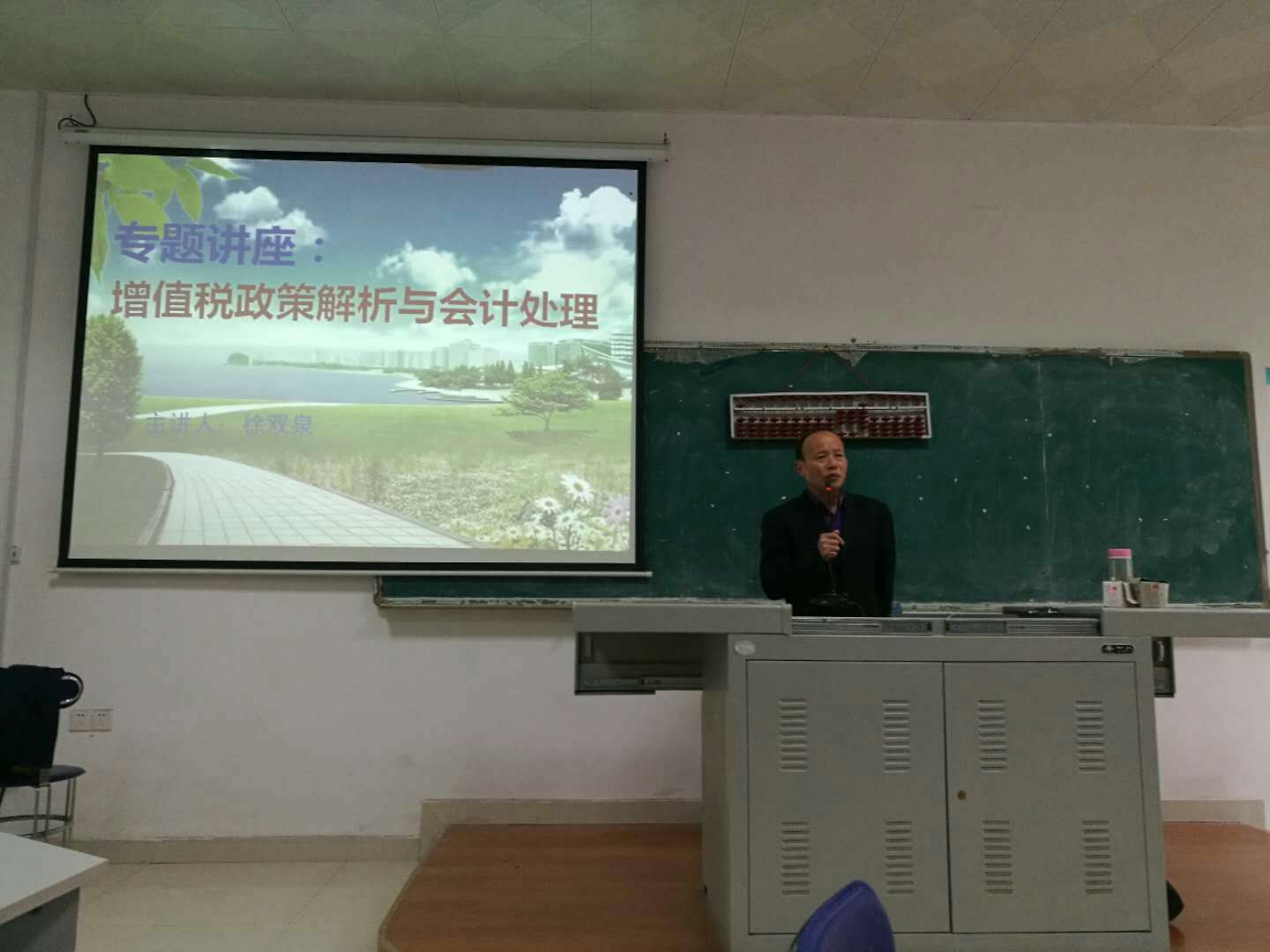 2017年11月8日四点半在实训楼第一实训室,聘请了财税金融学院的徐双泉教授为beat365教师做了《增值税政策解析与会计处理》的专题讲座。