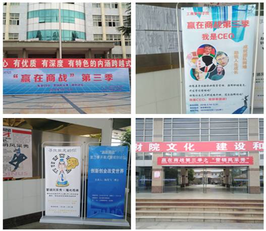 “赢在商战”是工商管理学院围绕国家优质校建设项目——市场营销专业群建设,着力打造的一项专业活动栏目。该栏目以“赛、学、教、考”四位一体为基本设计思路,旨在通过栏目内容的“三个对接”——与职业技能竞赛相对接、与课程教学与考核相对接、与双创教育和工匠精神培育相对接,推进“赢在商战”五个平台的建设——赛学结合的平台、教学改革的平台、校企合作的平台、第一二课堂融合的平台、专业群文化建设的平台,进一步创新以产教融合为主线的“赛学一体、双堂融合、多元共育”市场营销专业群人才培养模式,进一步丰富以“竞赛文化、专业社团文化、职场文化”为特色的市场营销专业群文化建设内容。