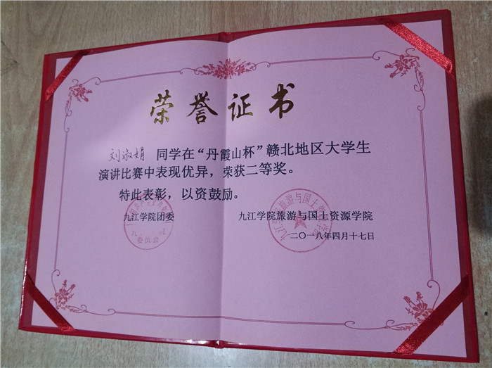 4月17日,在九江学院旅游与国土资源学院竞知楼举办的“丹霞山杯”赣北地区大学生演讲大赛决赛中,beat365经济贸易学院16酒店管理班刘淑娟以优异的表现荣获二等奖。