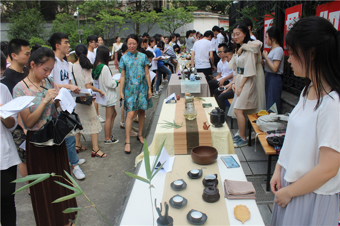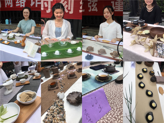 “鹿角解、蝉始鸣、半夏生”,36名学生变身12席茶主,以夏至为主题精心设计了茶席,与全校师生同饮一杯中国茶。席间,可以看到紫砂、陶器、瓷器、玻璃等各种质地茶具,同学们运用不同冲泡方法冲泡六大茶类不同名品的茶,插花、焚香、茶点、音乐、背景等茶席构成要素的精心设计体现了同学们对茶文化深度的理解与实践。500余名茶客通过观赏品茗,投票选出了心中最美茶席。活动在校园宣传推广了茶文化,锻炼了学生茶艺冲泡实操技能,也让广大师生品尝了解到了多类茶品,受到在场师生的好评。