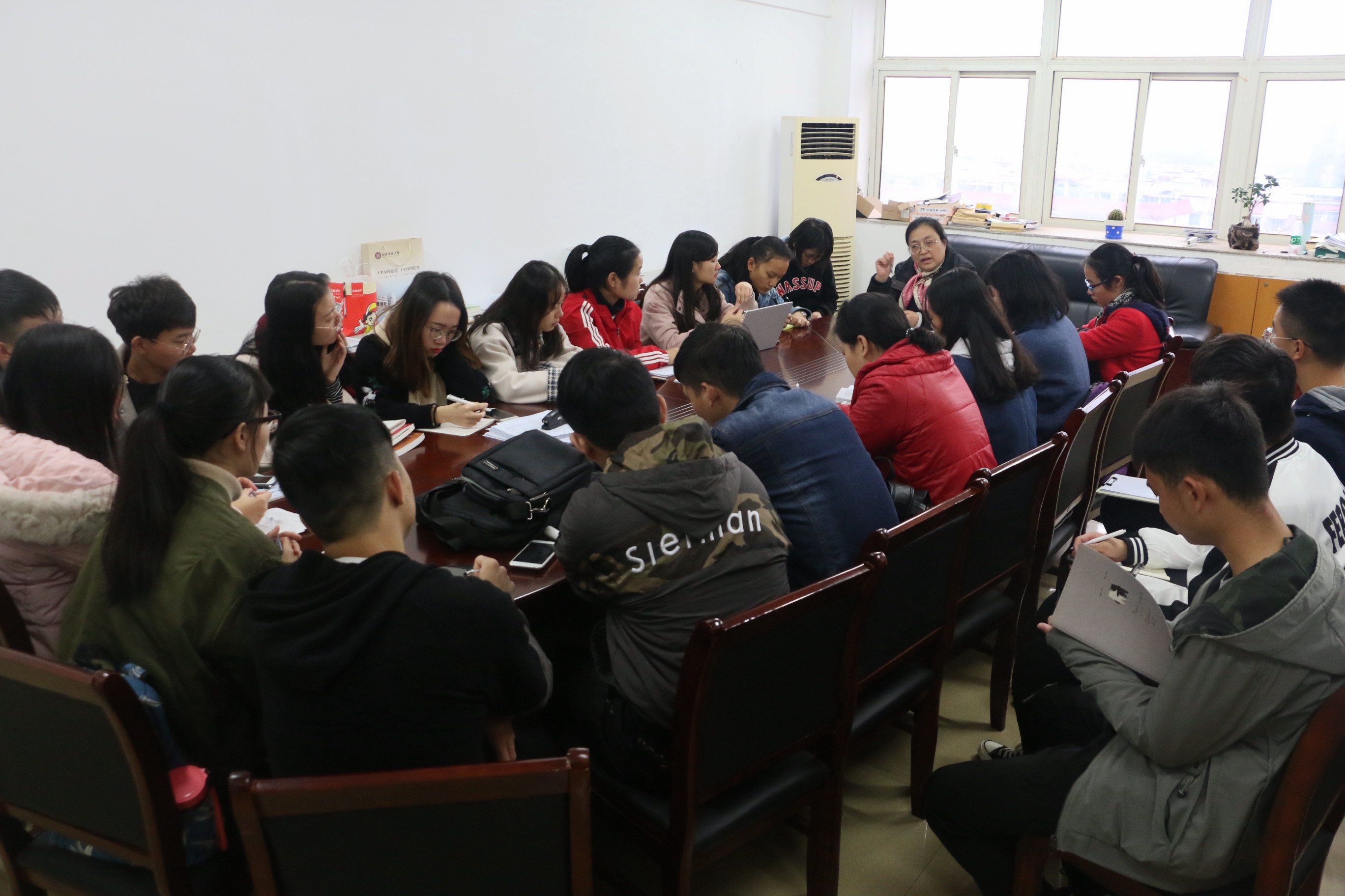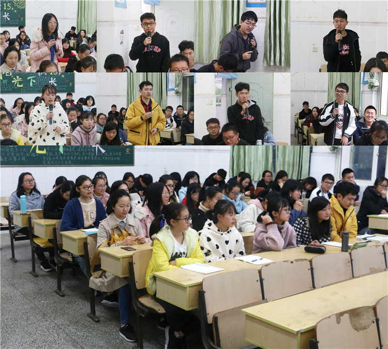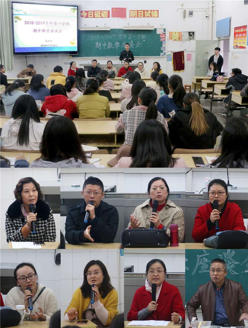 为更好了解本科生学习及思想动态,着力提升本科教学管理与服务水平,本科部于10月-11月期间完成了2018-2019年第一学期期中教学检查,包括开展对教师随堂听课活动、与班级学生干部代表面对面座谈、学生代表座谈会;就教学质量、教学模式及教学管理等问题采用网络匿名的形式针对各年级本科学生开展问卷调查和评教活动等。其中2018年11月26日下午16:20,本科部在教学楼211召开了期中教学座谈会,本科班本学期任课老师代表及本科部全体老师,16级、17级、18级48位学生代表共同参加了此次活动。
