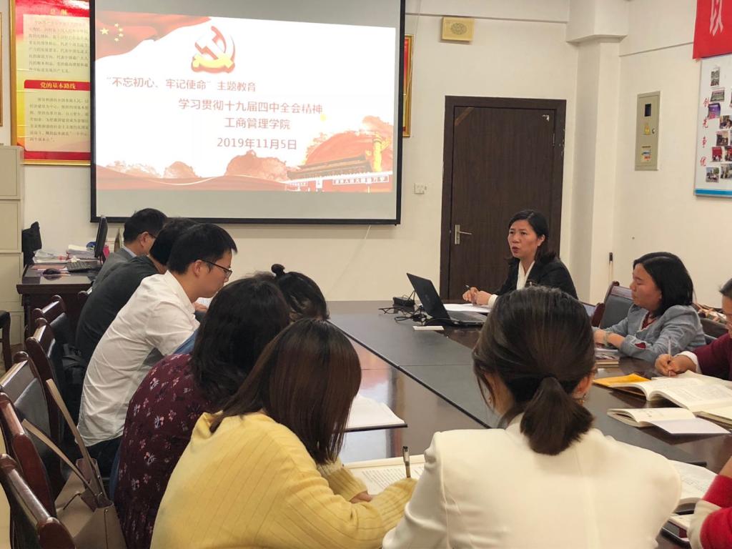 根据习近平总书记在“不忘初心、牢记使命”主题教育工作会议上的重要讲话精神,为牢牢把握“不忘初心、牢记使命”主题,持续推进“两学一做”学习教育常态化制度化,深入学习贯彻习近平新时代中国特色社会主义思想,工商管理学院于11月5日在综903会议室组织全体教职工学习党的十九届四中全会精神,会议由党总支书记胡红霞同志主持。