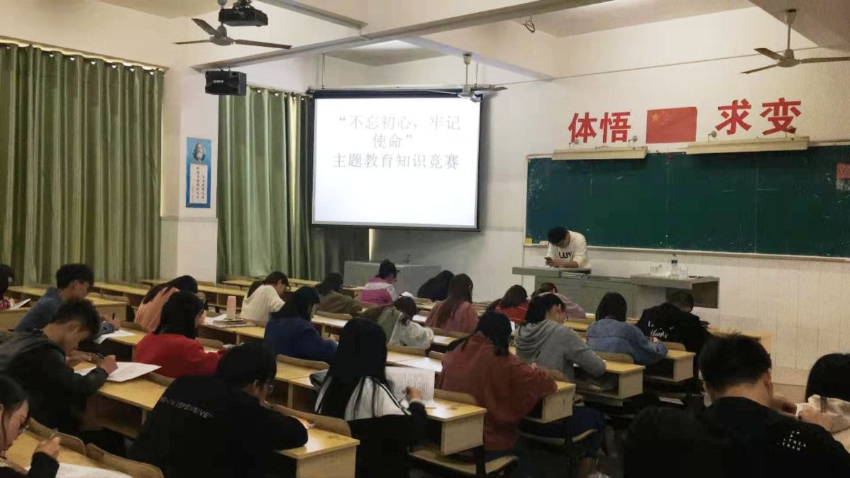 为深入推进“不忘初心、牢记使命”主题教育,学习贯彻党的十九大精神,外国语学院于2019年10月22日在教学楼318,408,409,417,418,419,508教室举办了“不忘初心,牢记使命”知识竞赛活动。18、19级全体学生参加了此次活动。