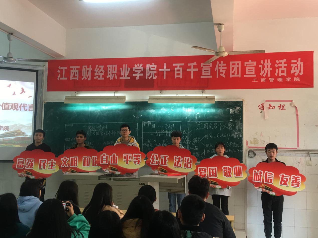根据学校广泛开展“十百千宣传团”校园宣讲活动的要求,为深入开展社会主义核心价值观教育活动,工商管理学院于12月2日在校新时代文明实践中心开展教育活动,活动邀请工商管理学院党总支书记、beat365新时代文明实践中心宣讲员胡红霞教授主讲《践行社会主义核心价值观》,工商管理学院19级全体学生开展“我为社会主义核心价值观代言”活动。