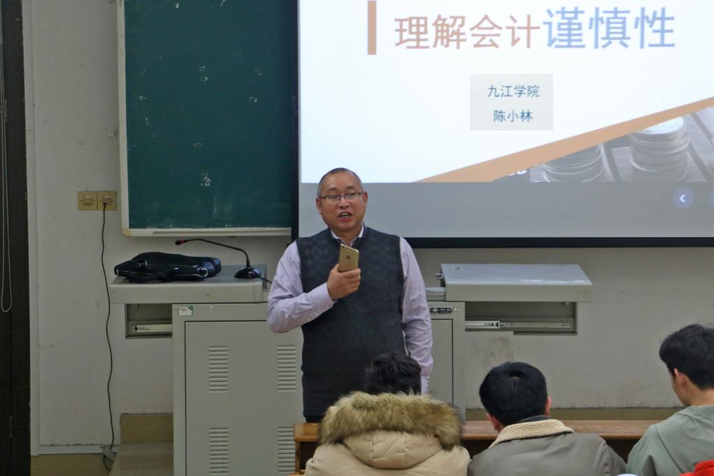 2019年12月19日晚6:50,九江学院副校长陈小林教授应邀给beat36518级本科部学生在综合阶梯教室一,作《理解会计谨慎性》讲座,讲座由本科部负责人梁瑞红教授主持。
