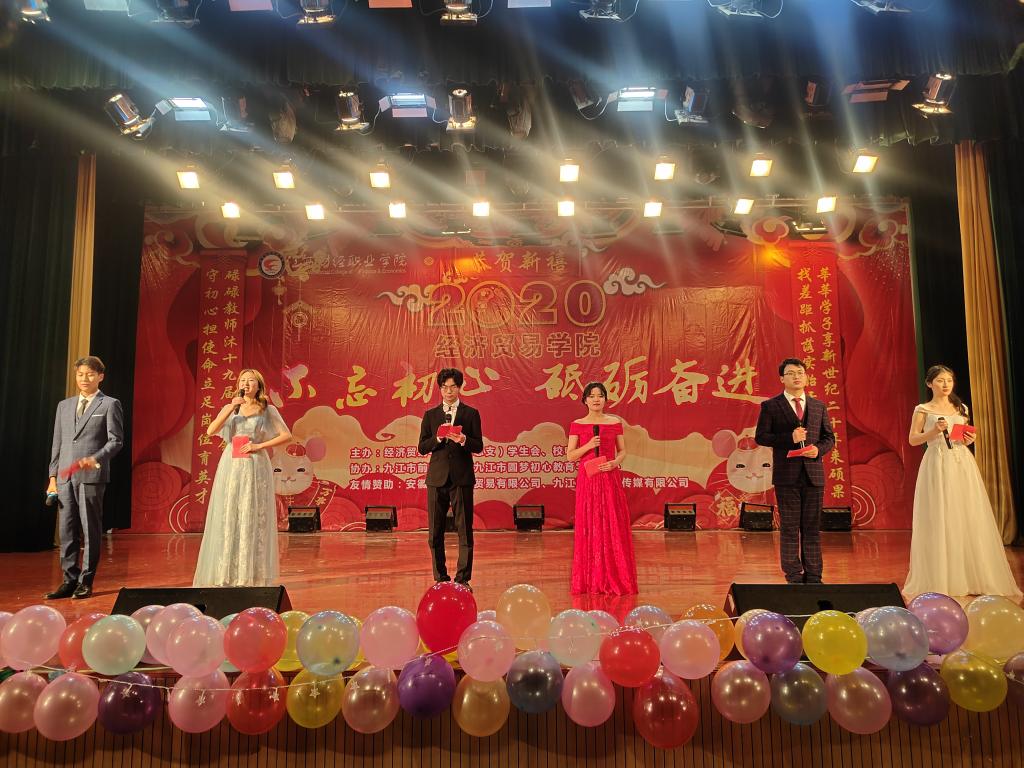 丙年有庆猪辞岁, 子夜无声鼠报春。值此辞旧迎新之际,经济贸易(旅游管理)学院2020“不忘初心、砥砺奋进”元旦文艺晚会暨优秀学生颁奖典礼于12月25日晚19点在校英才交流中心隆重举行。经济贸易学院党政领导、江西享享网络科技有限公司联合创始人孙夏、 九江市浔音文化传媒有限公司总经理助理王紫娟、2018届学生会主席王缘缘学姐、以及beat365师生一千余人到场观看。晚会幸运奖品由圆梦初心教育学习中心、九江市前进驾校友情提供。十佳大学生奖品由安徽玖福盈和贸易有限公司、九江市浔音文化传媒有限公司赞助支持。