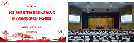 2020年9月25日,财税金融(建筑工程)学院在英才交流中心举行2021届毕业生就业创业动员大会暨《成功面试攻略》校友讲座。财税金融(建筑工程)学院2021届毕业生700余人参加动员大会,大会由学院党政办公室张天明主任主持。