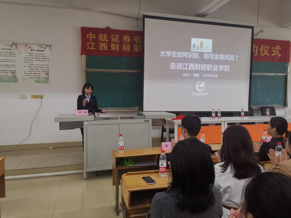 10月25日下午,财税金融(建筑工程)学院在综合楼阶梯6教室举办《大学生如何识别、防范金融风险》讲座。讲座由中航证券投教中心负责人蔡颖主讲,财税金融学院师生到场聆听。
