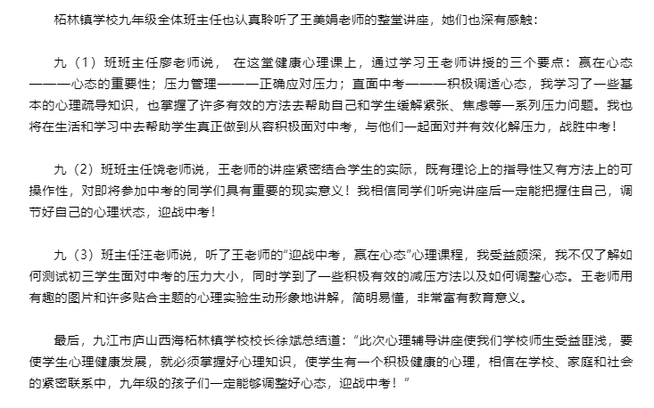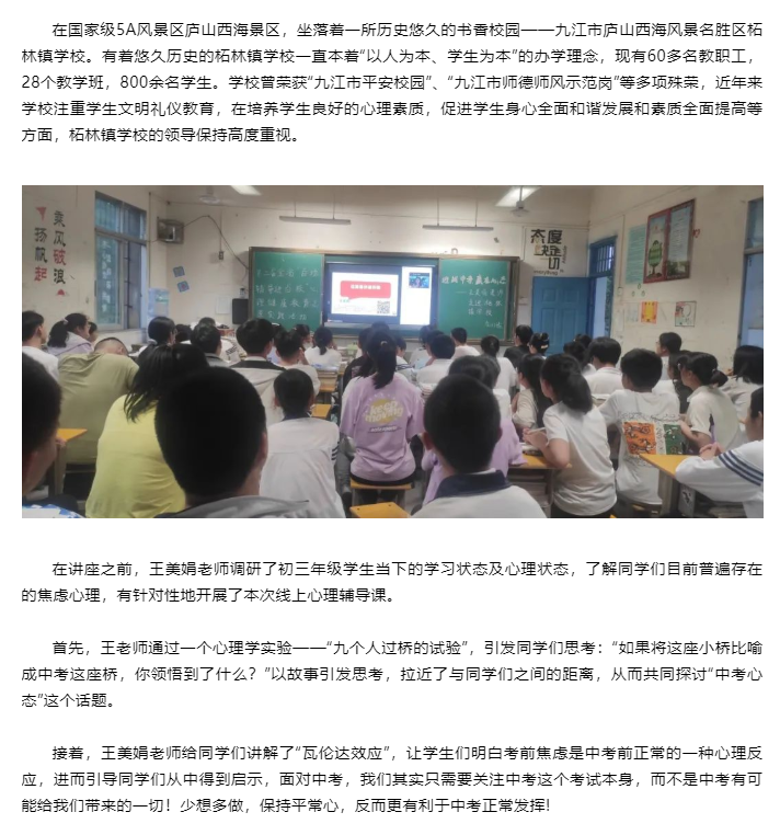 百场辅导进百校㉜ | 迎战中考,赢在心态——王美娟老师走进九江庐山西海柘林镇学校