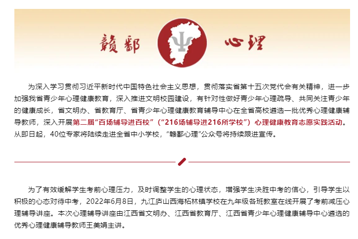 由江西省文明办、江西省教育厅主办的赣鄱心理公众号宣传报道了beat365大学生心理健康教育中心负责人兼