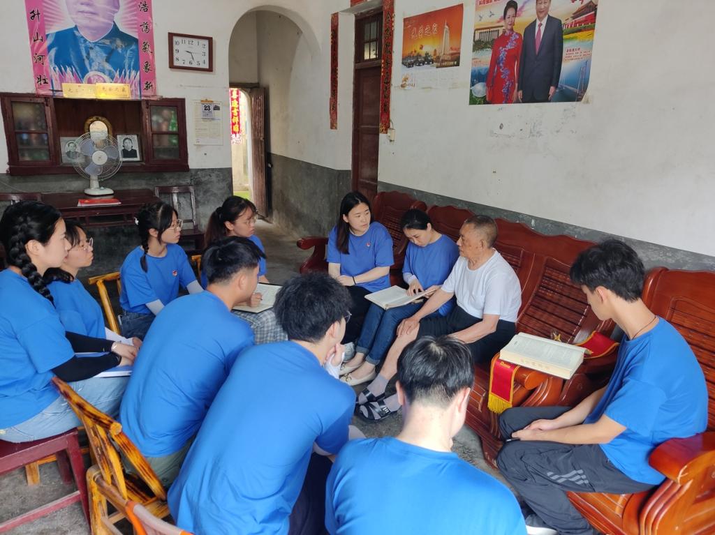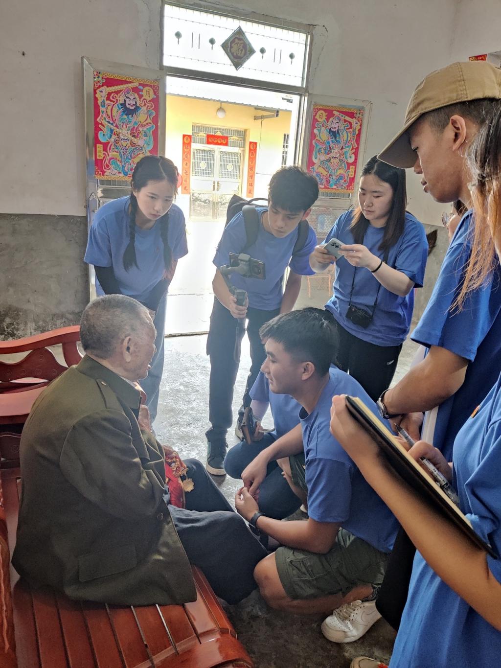 图为队员们聆听老人回忆革命事迹。中国青年网通讯员 吴宇翔 摄