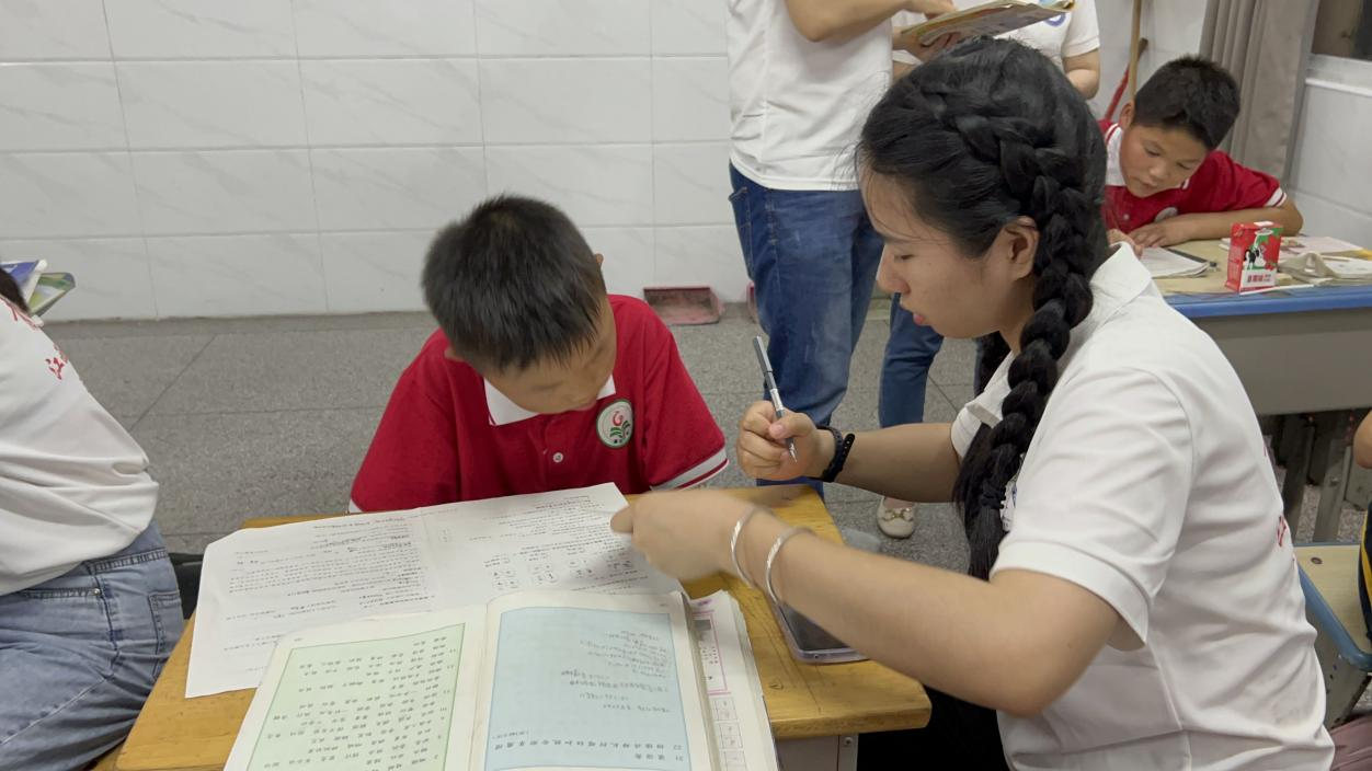 图为队员辅导学生们课后作业。中国青年网通讯员 龚尔洁 摄