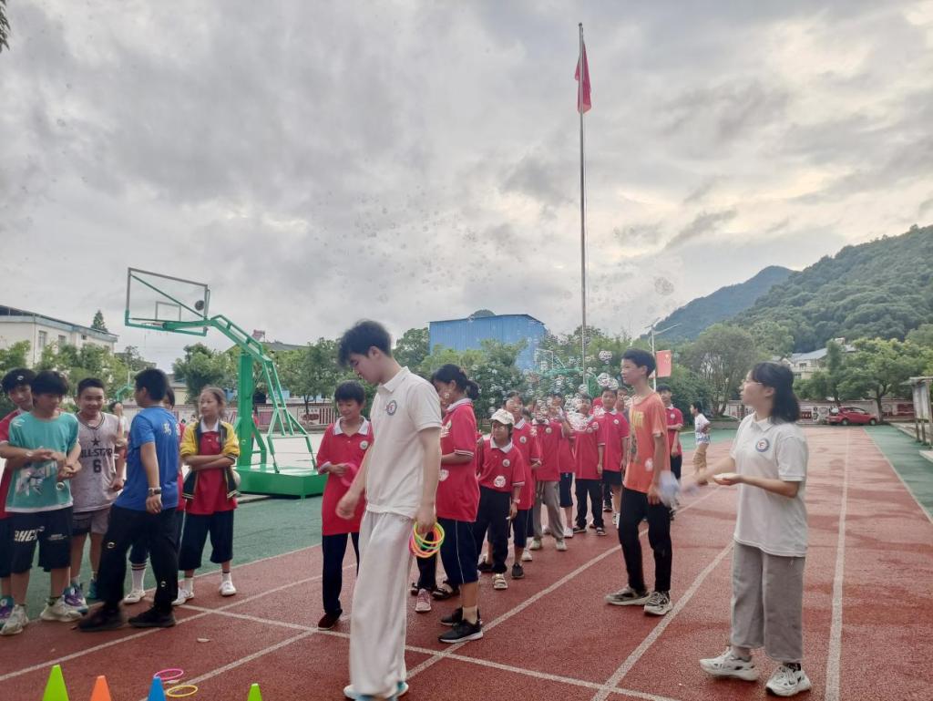 图为队员在室外和学生们互动益智游戏。中国青年网通讯员 李娟 摄