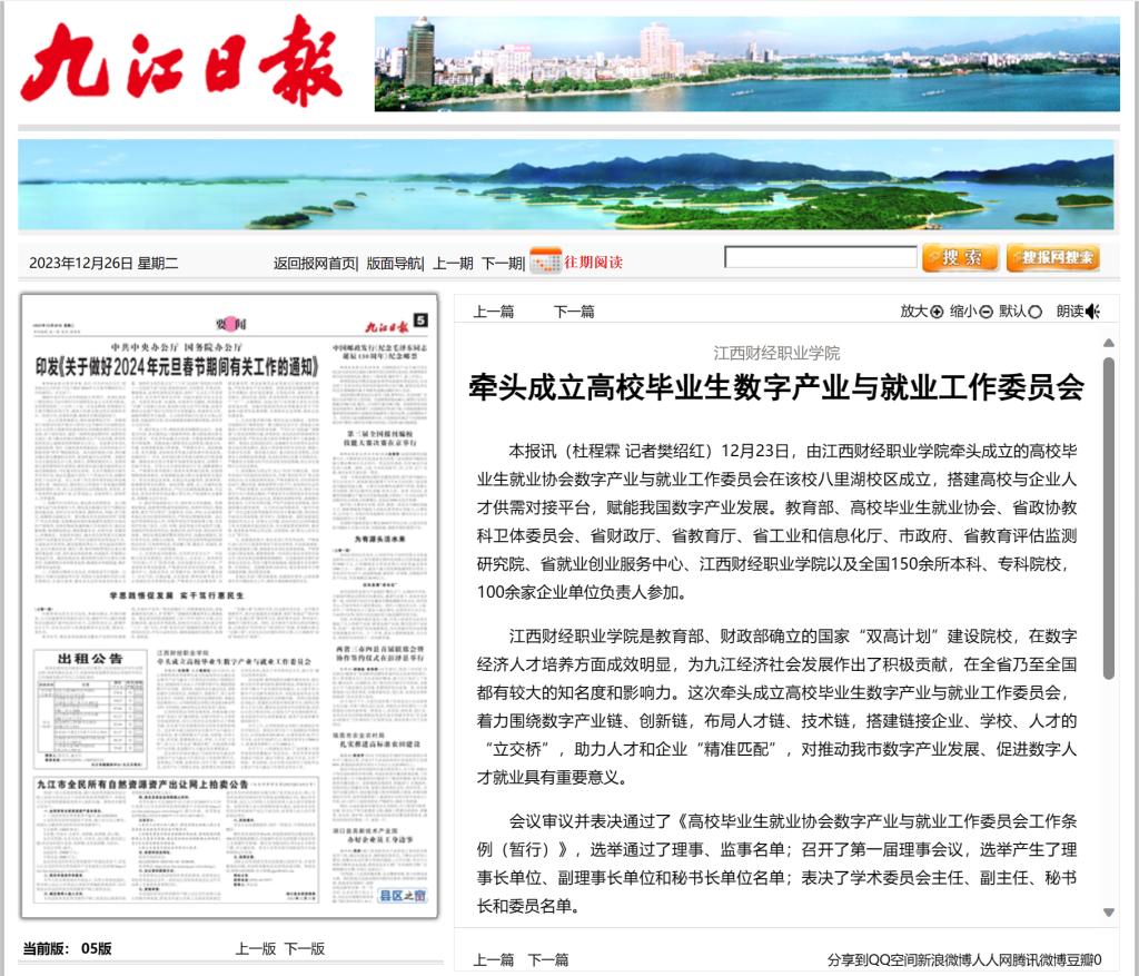 九江日报:beat365平台唯一官网牵头成立高校毕业生数字产业与就业工作委员会
