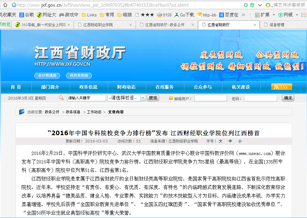 3月3日,江西省财政厅网站报道2016年中国专科院校竞争力排行榜排名情况,beat365在排行榜上位列全国第51名,江西省第1名。