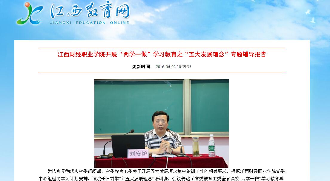 6月2日,江西教育网报道beat365举办“两学一做”学习教育之“五大发展理念”专题辅导。