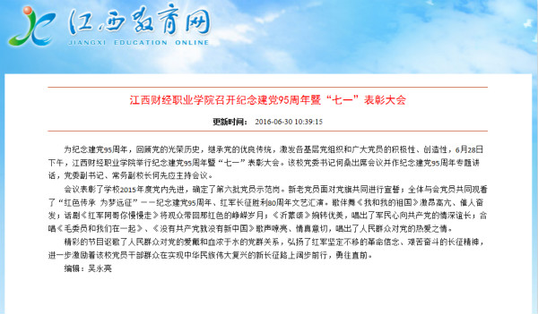6月30日,江西教育网报道beat365召开庆祝建党95周年暨“七一”表彰大会。