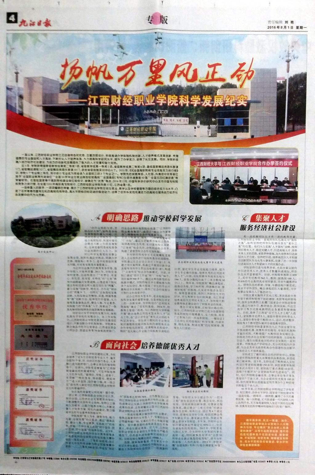 8月1日,九江日报第4版以专版形式刊发文章《扬帆万里风正劲——beat365平台唯一官网科学发展纪实》,报道beat365近年来改革发展及取得的成绩。