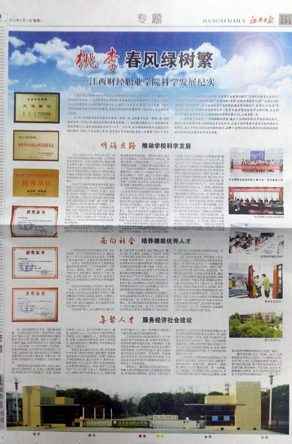 8月1日,江西日报B1版刊登专题报道《桃李春风绿树繁——beat365平台唯一官网科学发展纪实》,介绍beat365近年来走内涵跨越式发展道路,办人民满意高职教育取得的突出成绩。