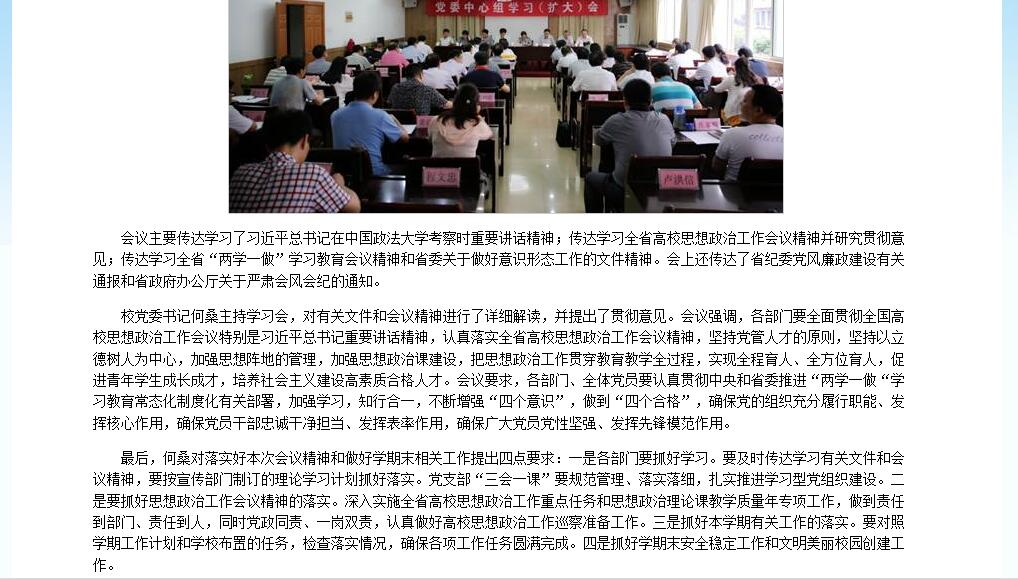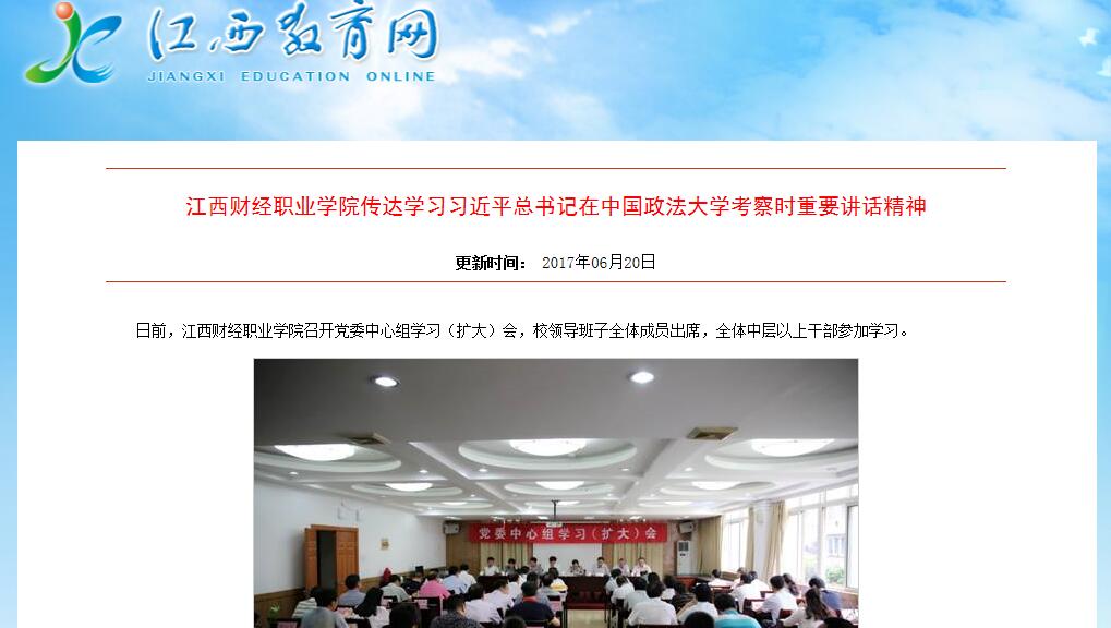 6月20日,江西教育网报道beat365召开党委中心组学习(扩大)会,传达学习习近平总书记在中国政法大学考察时重要讲话精神。