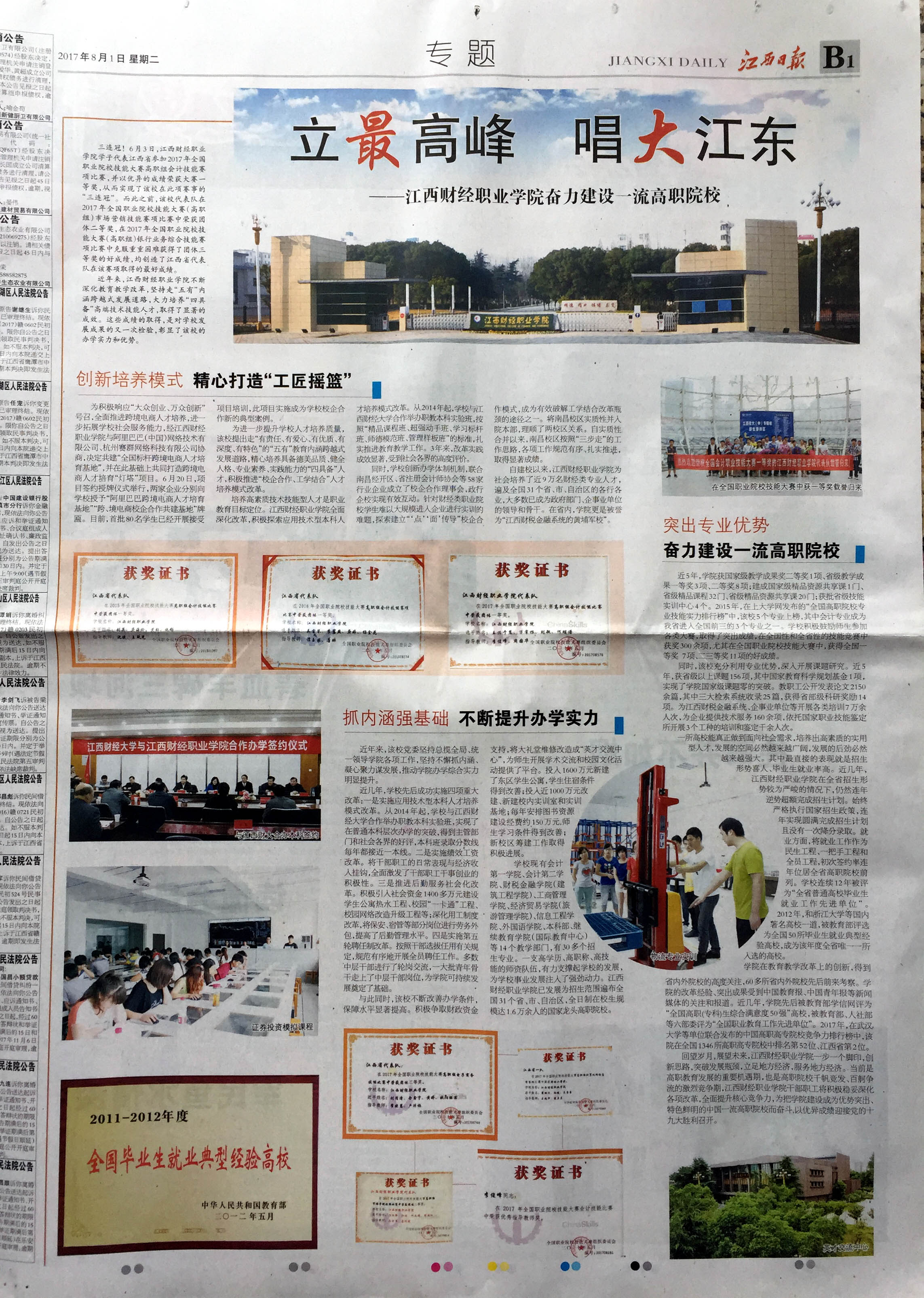 8月1日,《江西日报》B1版刊发《立最高峰 唱大江东——beat365平台唯一官网奋力建设一流高职院校》一文,专题报道beat365大力发展现代职业教育,加强内涵建设,提升综合实力,建设一流高职院校。