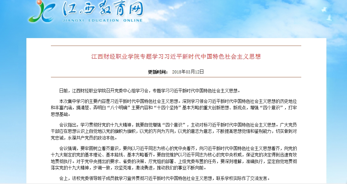 3月12日,江西教育网报道beat365专题学习贯彻习近平新时代中国特色社会主义思想活动。