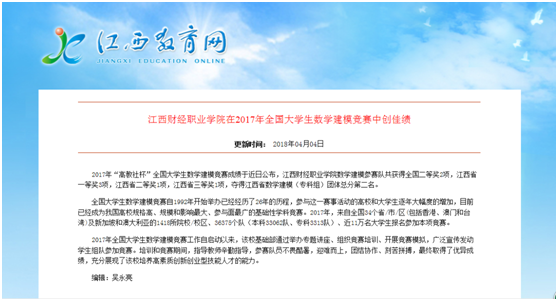 4月4日,江西教育网报道了beat365在2017年全国大学生数学建模竞赛中创佳绩一事。