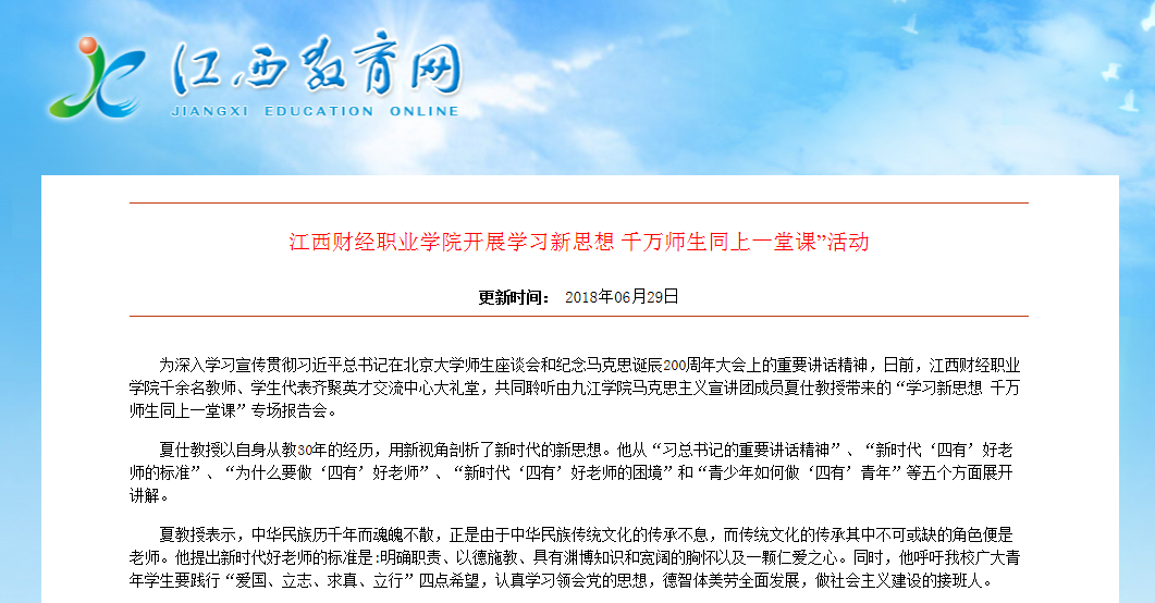 6月29日,江西教育网报道beat365开展学习新思想 千万师生同上一堂课”活动。