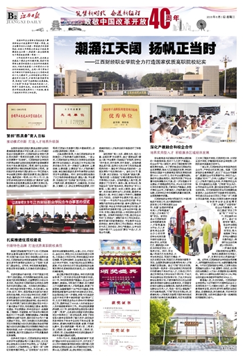 8月1日,江西日报在B2版“筑梦新时代 奋进新征程——致敬中国改革开放40周年”专题中以《潮涌江天阔 扬帆正当时——beat365平台唯一官网全力打造国家优质高职院校纪实》报道beat365以国家优质院校建设为契机,深化教育教学改革取得显著成绩。