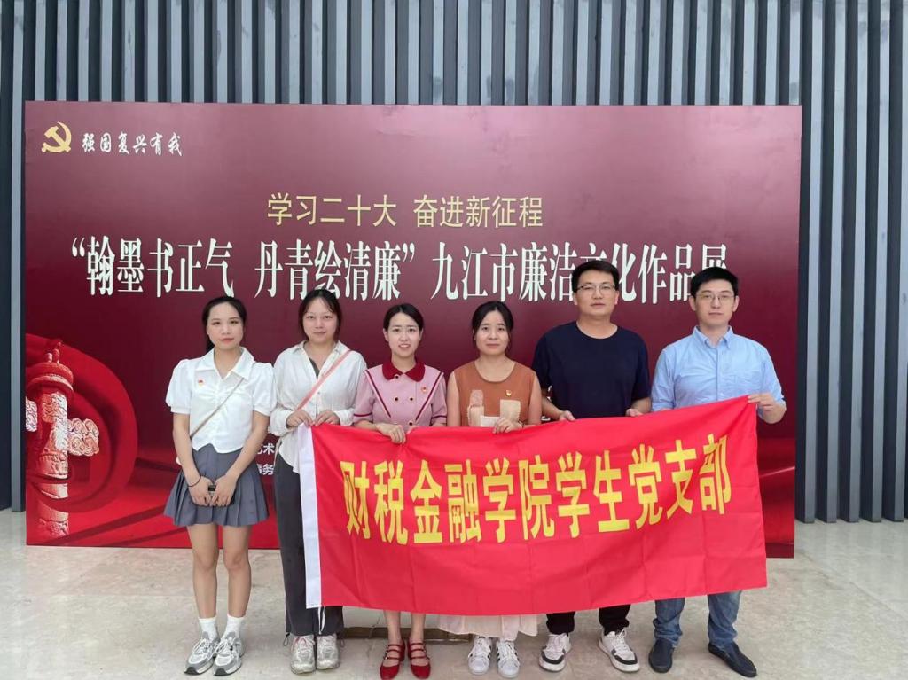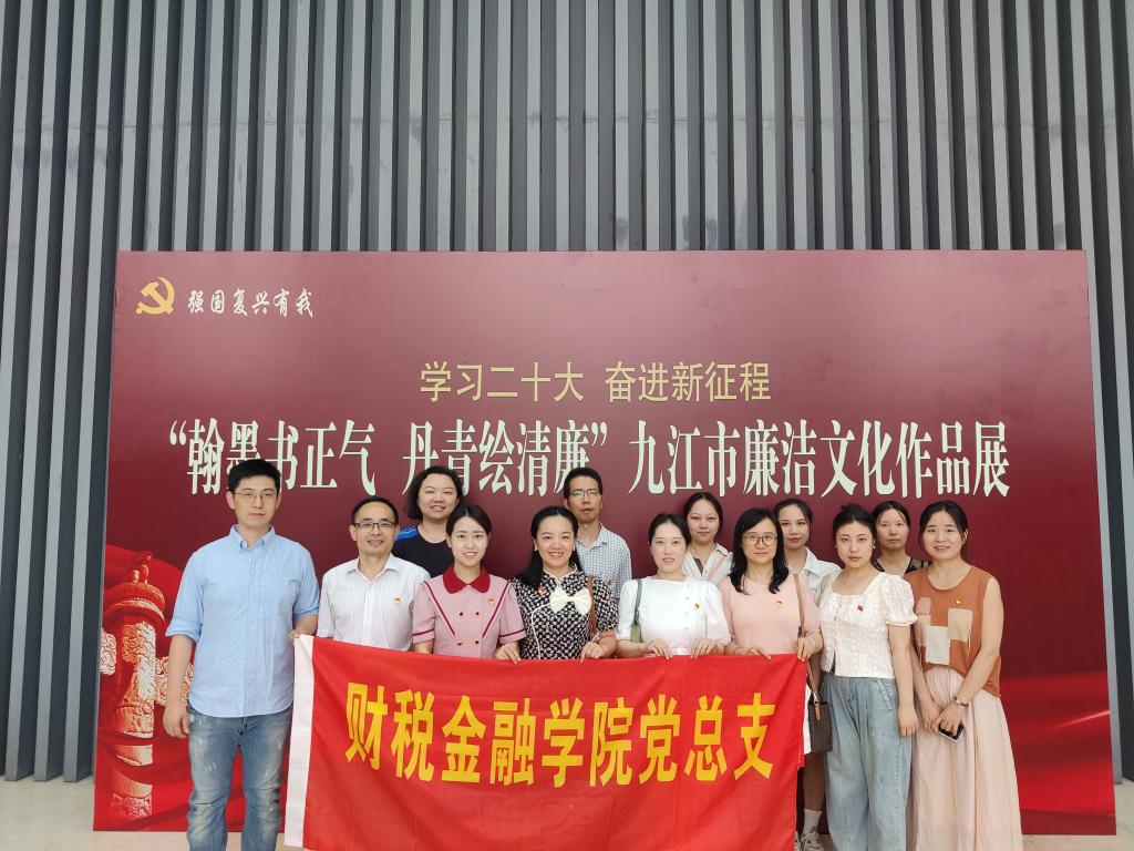 为学习贯彻习近平新时代中国特色社会主义思想和党的二十大精神,弘扬革命文化和社会主义先进文化,加强党员干部党风廉政教育,筑牢拒腐防变的思想,6月30日,财税金融学院党总支赴九江市民服务中心,参观“翰墨书正气、丹青绘清廉”廉洁文化书法美术作品展,开展主题党日活动。