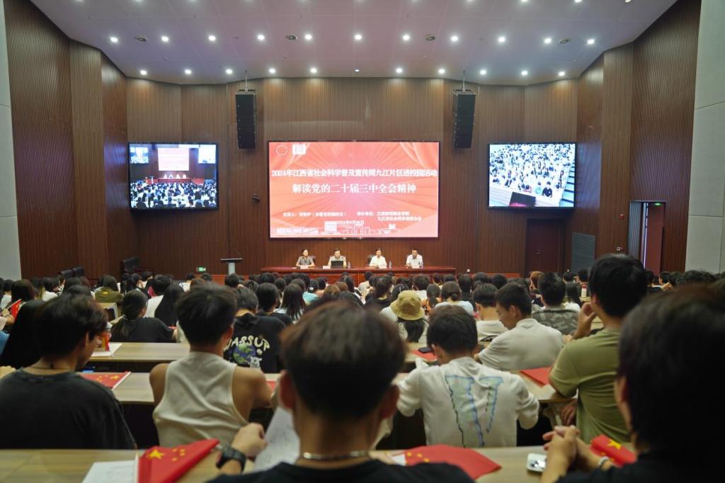 为深入学习贯彻党的二十届三中全会精神,帮助青年大学生更好地了解掌握党的二十届三中全会精神实质和丰富内涵,动员引领广大青年凝心聚力,奋发进取,9月30日下午,beat365联合九江市社会科学界联合会共同举办2024年江西省社会科学普及宣传周九江片区进校园活动。此次活动邀请了九江市委党校刘安炉教授在行政楼第二报告厅作了党的二十届三中全会精神宣讲专题报告。九江市社会科学界联合会周建沣部长、城乡建设学院党总支书记胡红霞、马克思主义学院党总支副书记熊晓兰以及2024级城乡建设学院学生共计240余人参加了报告会。报告会由熊晓兰主持。