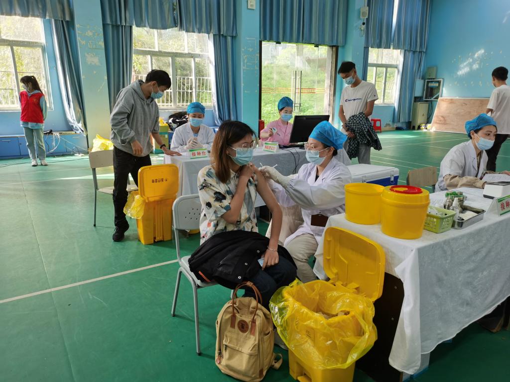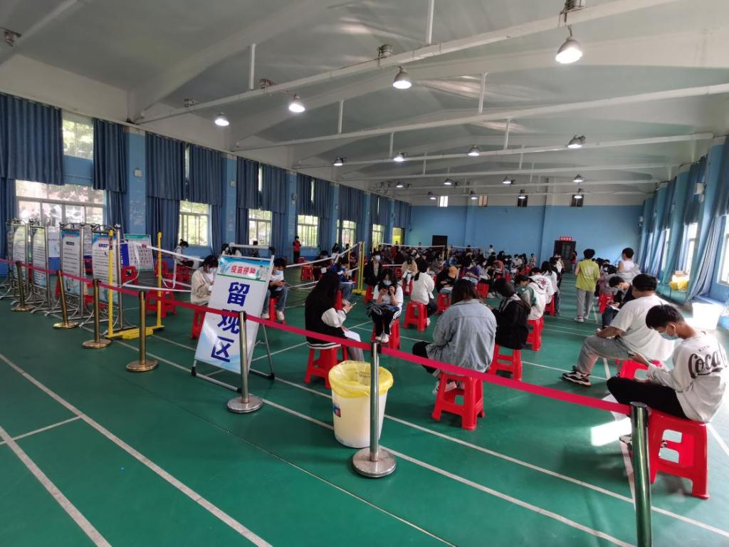 在志愿者的引导下,接种者佩戴口罩,携带身份证等证件,完成知情同意书签署、个人信息登记录入等程序,依次进行疫苗接种,留观30分钟无异常情况后再盖章离场。为应对接种期间紧急情况的发生,学校与相关医疗部门制定了应急方案,在观察区准备了急救设备和医疗场地。