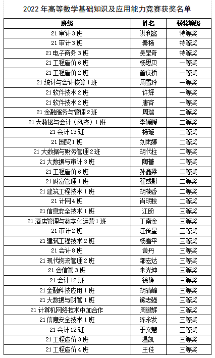 学校领导和学院领导高度重视此次竞赛,基础教育学院数学教研室负责落实本次数学竞赛各项工作,承担组织、监考、出卷、阅卷等任务。经过数学老师们的认真阅卷,三十三名同学成绩突出,荣获奖项。具体获奖名单如下: