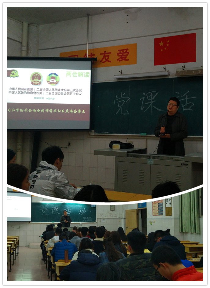 为加强学生党员的政治理论学习,3月23日晚7点整,在教学楼701教室,经贸旅游学院学生党支部邀请党员老师陈旋同志以“学习贯彻党的两会精神”为主题对学生党员进行党课培训,经旅学院学生党支部40余名学生参加了培训活动。